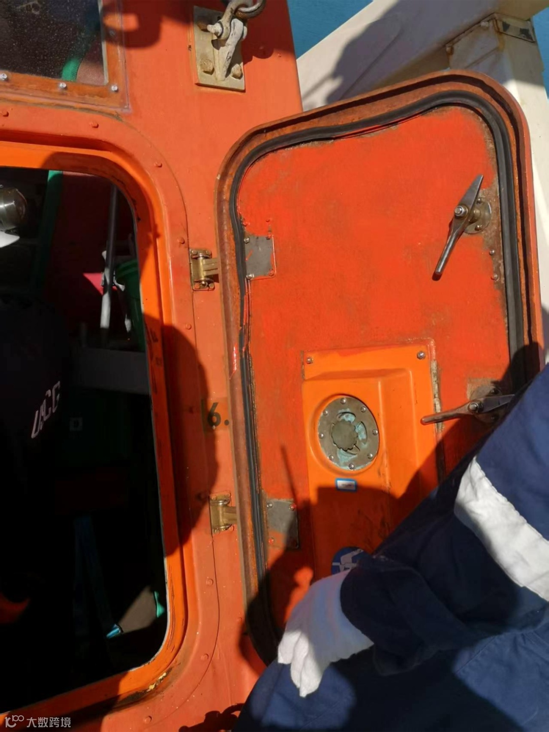 2. 救生艇外观检查,吊艇钩头活络情况以及救生艇主挂钩情况,动艇机,进行正倒车试验及转舵试验,试验应急舵正常,打开救生艇搜救灯和示位灯均正常,查看救生艇内设备及备品;
