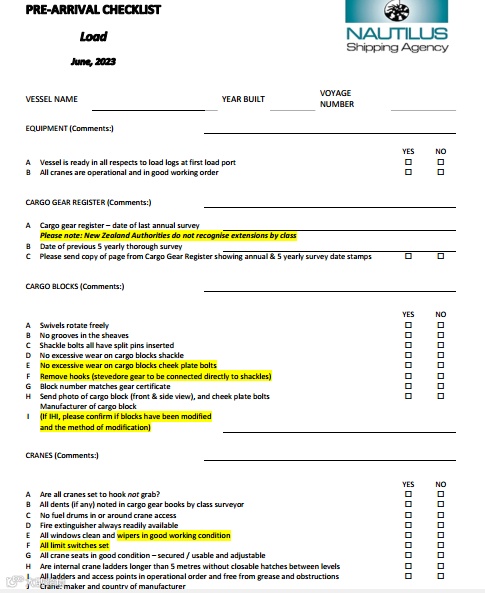 新西兰装木材均是用船上的克令吊装载,装木材前岸上会有CRANE SURVEYOR上船进行严格的克令吊检验,俗称验吊。只有检验合格才能进行装货作业,这样克令吊的日常保养和检查就尤为重要。新西兰不接受船级社关于克令吊的任何延期检验。关于克令吊钢丝的更换时间参考代理发船的PRE-ARRIVAL CHECKLIST 里的一段话: