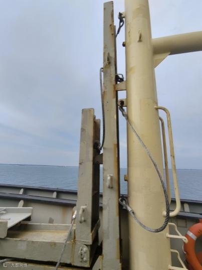 一人沿梯子爬到固定立柱上系好安全带,把带绳的木柄滑车固定在固定立柱上。甲板上的船员利用木柄滑车把提前穿有拉起钢丝的导向滑车拉送至固定立柱眼环处。固定立柱上的船员用卸扣把导向滑车固定到眼环里。甲板上的导向滑车用卸扣固定到甲板上的眼环中。导向滑车是开口的,把钢丝放到导向滑车里。拉活动立柱的钢丝一头用卸扣固定到第一个活动立柱上的眼环里,钢丝的另一头用卡拉姆做成一个眼环。