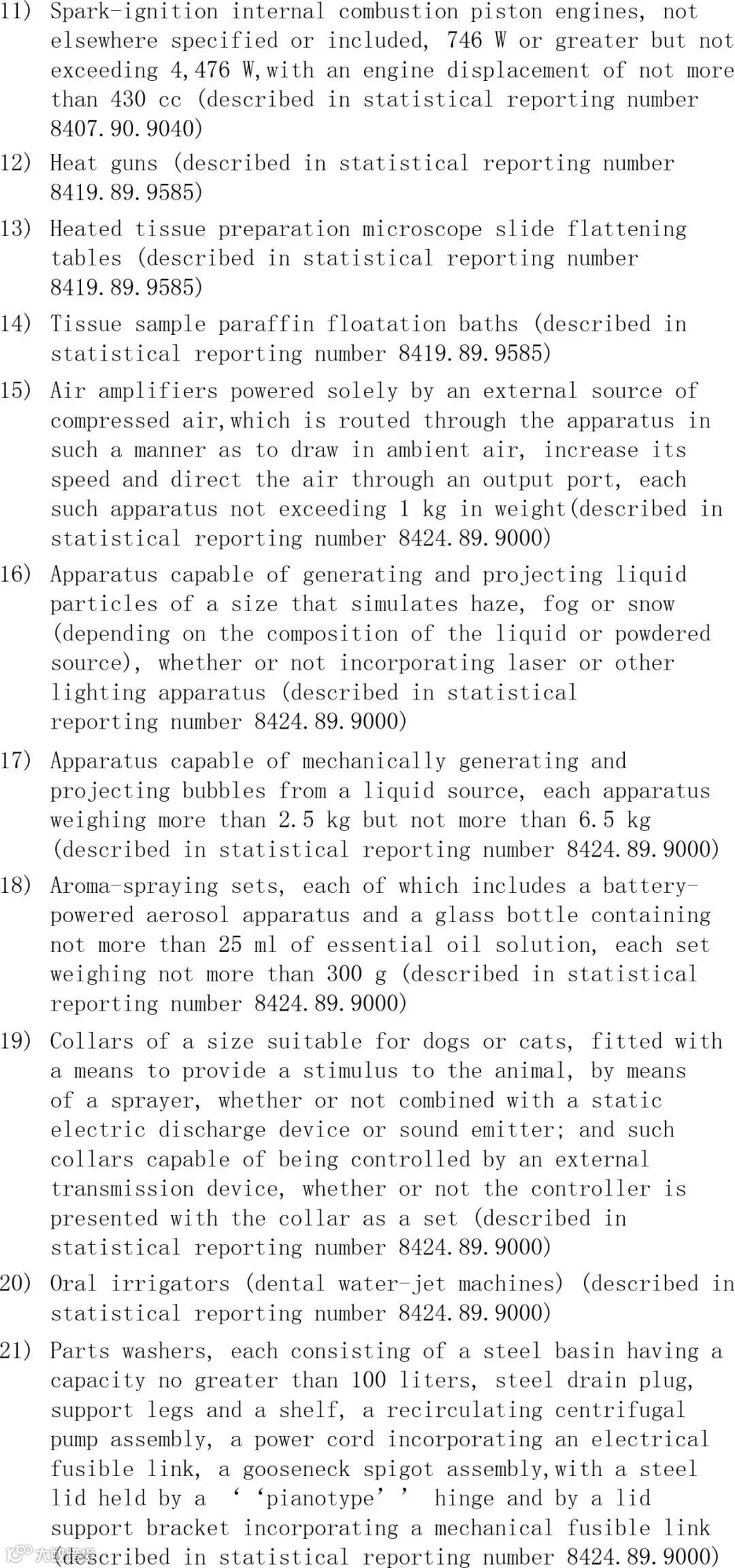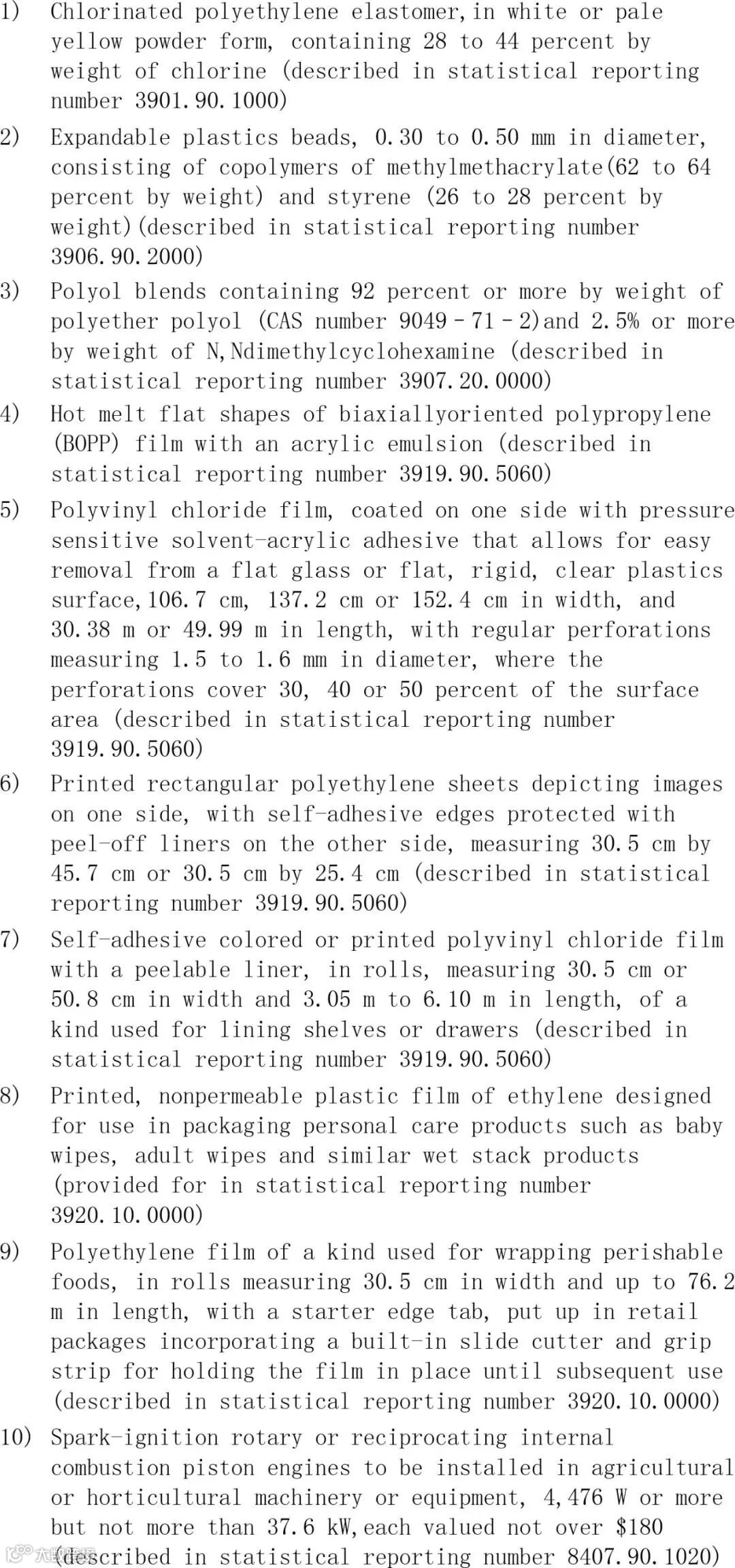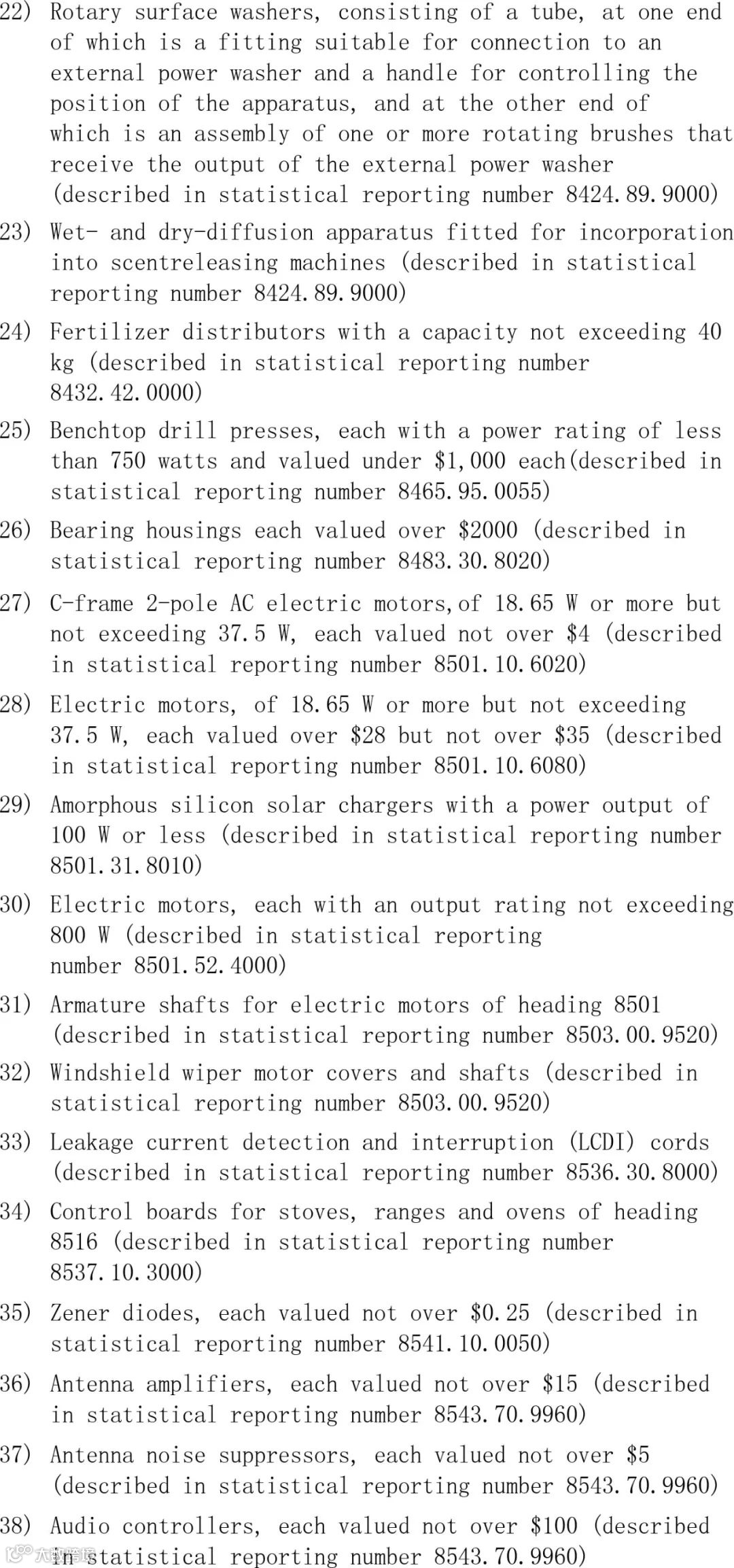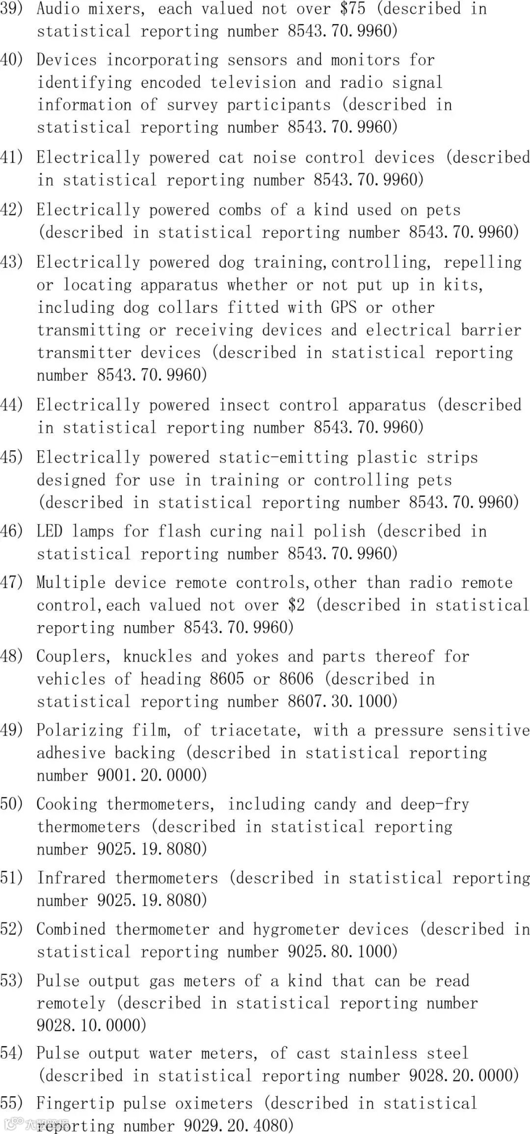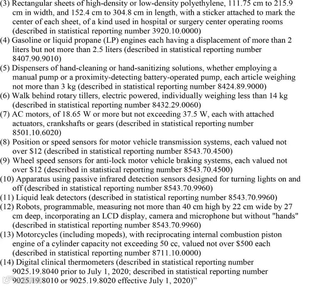 当地时间7月27日,美国贸易代表办公室(USTR)公布了一批排除加征关税延长期限清单(160亿美元清单内商品),主要是针对2019年7月31号公布、有效期于2020年7月31号为止的排除清单中的部分中国商品,延长豁免期限到2020年12月31日。 原关税排除清单共包含有69类商品,其中14类商品可延长排除清单期限至2020年12月31日。 未获得延长有效期的产品有:氯化聚乙烯橡胶、可发性塑料珠、聚氯乙烯薄膜、聚乙烯薄膜、火花点火式内燃机、热风枪、空气放大器、喷香机套装、冲牙器、零件清洗机、旋转式清洗机、施肥机、台式钻床、轴承箱、电动机、非晶硅太阳能充电器、电机电枢轴、火炉控制板、稳压二极管、天线放大器、天线噪声抑制器、音频控制器、混音器、电动宠物梳子、LED指甲油快干灯、液体泄漏探测器、偏光板、烹炒温度计、红外线温度计、温度计湿度计组合设备、脉冲输出式煤气表和水表、指夹式脉搏血氧仪等55类商品。 注意:编码9025.19.8040比较特殊,大家注意梳理: 1.编码9025.19.8040于2020年7月10日进行修订,拆分为编码9025.19.8010和9025.19.8020。 2.编码9025.19.8040有两个排除产品描述是一致的,但又隶属于不同排除批次(第7批和第13批),这就导致了同一排除产品描述却有不同的排除有效期。 3.本次USTR延长排除有效期的排除描述为“Digital clinical thermometers”,与之前的排除描述“Digital clinical thermometers, valued not over $11 each”相比,删除了“valued not over $11 each”的排除描述。