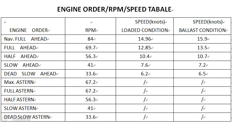 NOTE: Critical revolutions:43~51.5rpm,emergency full ahead to full astern 617s(约10分钟),stop to astern 275s(约5分钟),astern power 30% ahead,max.No. of consecutive start 14.