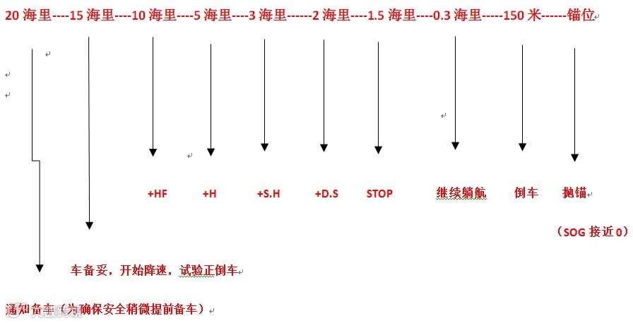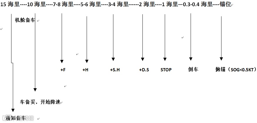 另外本船机舱备车需要40分钟左右,一般距离锚位15-20海里通知机舱备车,如遇锚地及附近通航密度大或天气状况差等原因可以20-30海里甚至更早通知机舱备车,总之根据当时环境在保障安全的前提下灵活掌握,通常距离锚地10海里车备妥,注意长时间海上航行后在需要操纵主机前要在船速降低到5节以下进行倒车实验,巴拿马型船一般抛锚操纵过程如下: