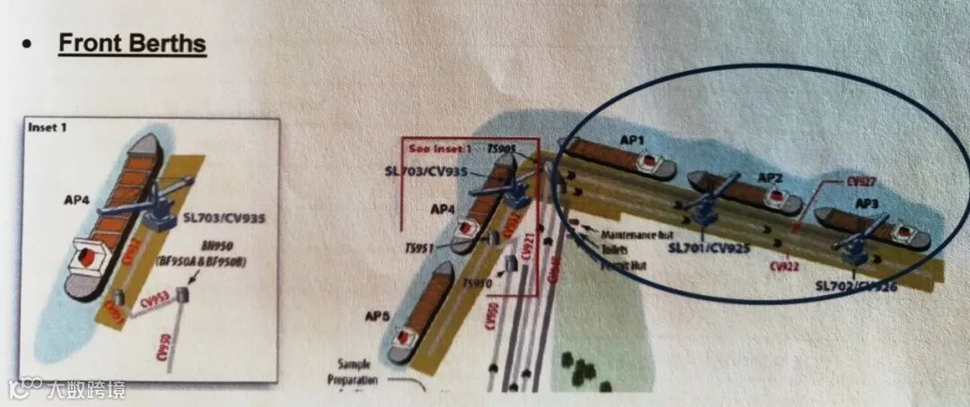 黑德兰港口的码头中,属于FMG的装货码头编号为AP1-AP5(Anderson Point 1-5)。AP1-AP3为左舷靠泊,装货机两台:SL701和SL702。AP4、AP5为右舷靠泊,装货机一台:SL703。船舶无论靠哪个泊位,都只有一个装货机给船装货,但不要小瞧一个装货机的能力,货源充足情况下,装货速度极其快,最大速度能够达到每小时装货12,500吨。