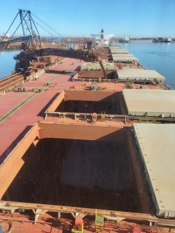 装货期间,当班驾驶员应监督Ship Loader装货的舱口是否与大副做的配载计划一致。平板上的装货计划是大副与Surveyor核对过的,但尽量还是要两个一起核对。在装每个舱口前应先与Ship Loader确认即将装货的舱口号码,并且去现场核对。本轮V087航次装的是两种类型矿砂,2、4大舱与1、3、5大舱的货种不同,若Ship Loader 将货装错了舱口,可想而知会给船方造成多大的麻烦。Ship Loader会经常对讲机叫过来,询问船舶横倾的角度,当班驾驶员可以看办公室的倾斜仪或船中的平衡水管读数告知他,若船舶横倾太大会影响到船舶排放压载水和船体强度,也应主动告知Ship Loader。每轮次装货完毕后,要询问Ship Loader 装货量并与平板上的数值核对。开始、暂停、完货的时间也要及时记录。