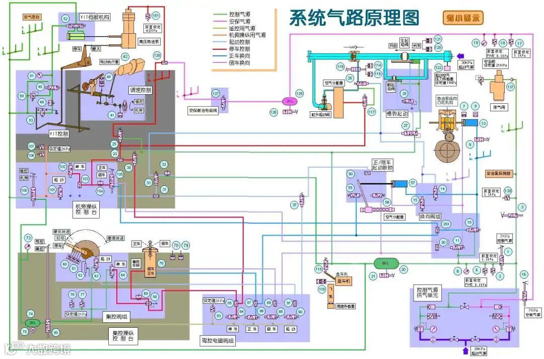 所以我们对84号和85号阀进行拆检,电磁线圈检查测量。通过解体以上阀,结果是电磁阀和双位止回阀的阀芯无明显卡阻现象,仅电磁阀阀芯的一密封较松弛(密封的作用是分隔气腔)能自由倒出,似乎不严密。为了有一个比较,在装复阀板时,将停车电磁阀(84)和起动电磁阀(90)互换安装。主机试车发现,仍然是集控室正常,驾控不能启动运行。现在问题很明显就是集控室不能转驾控,遥控控制系统相关气动阀件可以确认没有问题,那么问题到底出在哪里呢?是否是相关电信号传送问题?
