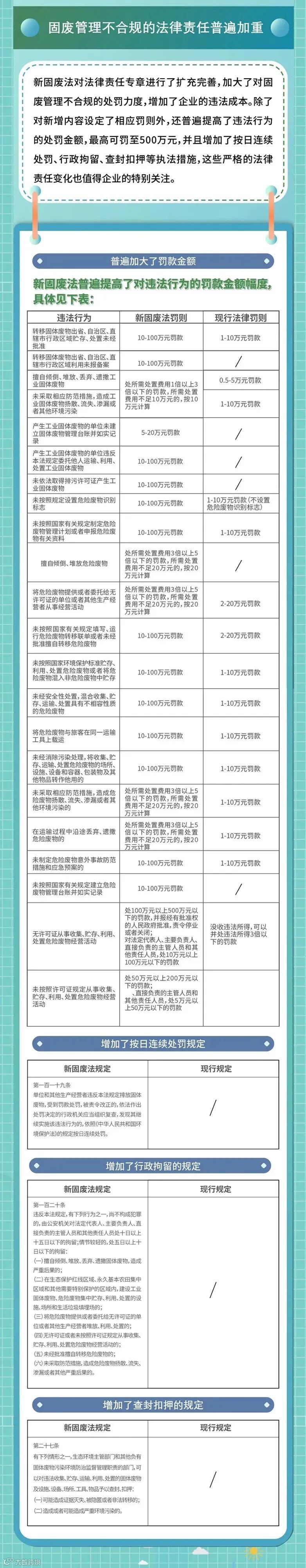新修订的固废法明确固体废物污染环境防治强化政府及其有关部门监督管理责任,完善了工业固体废物、生活垃圾、危险废物、建筑垃圾、农业固体废物等污染环境防治制度,健全了保障机制,严格了法律责任。