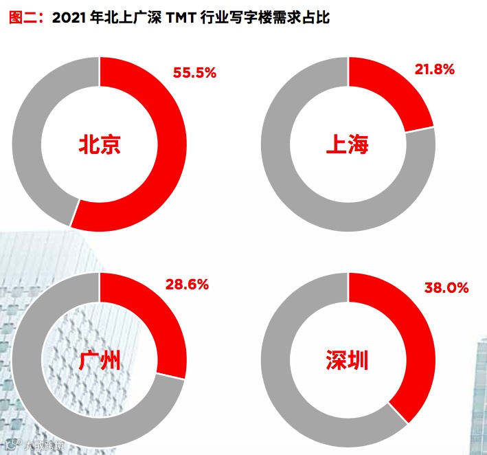 而从写字楼市场而言,TMT产业在过去几年一直是写字楼市场需求的重要支撑产业,2021年,来自 TMT 行业的写字楼需求在北上广深四个一线城市中的占比分别达到了55.5%,21.8%,28.6%及38%(图二)。随着政府对于数字经济的大力扶持,未来 TMT 行业仍将在写字楼需求方面扮演重要角色。