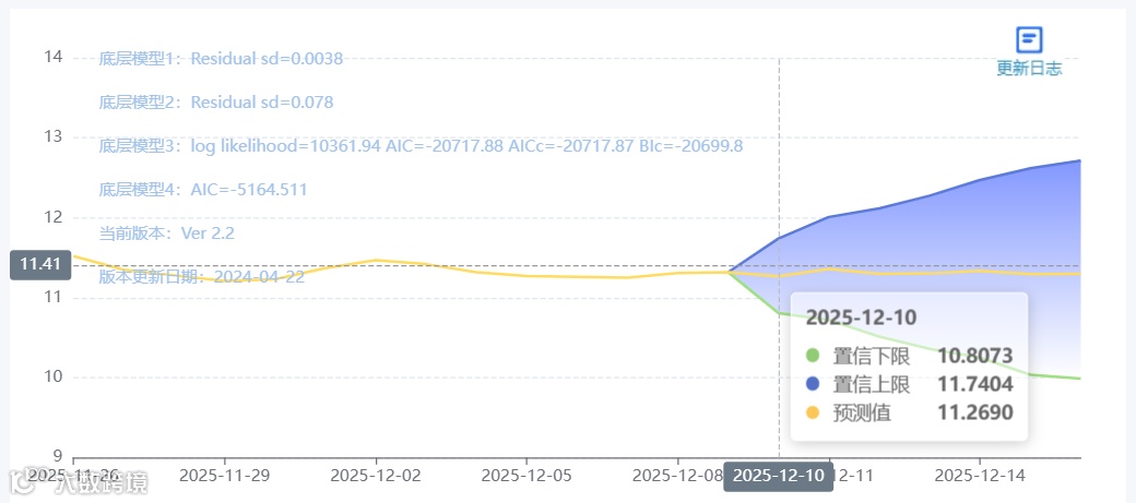 玄田算法是由项目课题组团队原创的非经典逻辑数值聚合理论和不确定性预测方法,构建了基于一致模算子的生猪价格预测模型。该模型采用的聚合函数及一致模相关理论与方法已获得多项国家自然科学基金和省级自然科学资金资助,并获得多项省级自然科学奖奖项。12月10日预测猪价为11.2690,置信区间在10.8073-11.7404之间。12月11日预测猪价为11.3589;12月12日预测猪价为11.3003。