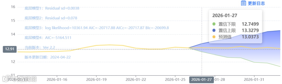 玄田算法是由项目课题组团队原创的非经典逻辑数值聚合理论和不确定性预测方法,构建了基于一致模算子的生猪价格预测模型。该模型采用的聚合函数及一致模相关理论与方法已获得多项国家自然科学基金和省级自然科学资金资助,并获得多项省级自然科学奖奖项。01月27日预测猪价为12.9480,置信区间在12.2891--13.6236之间。01月28日预测猪价为12.8845;01月29日预测猪价为12.9594。
