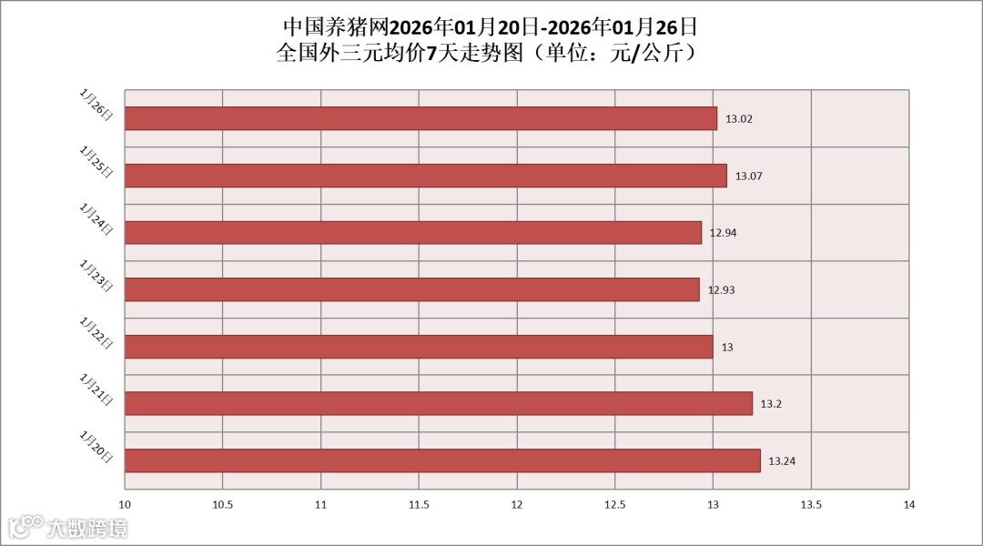 2026年01月26日(星期一),据中国养猪网猪价系统监测,全国外三元均价为13.02元/公斤,猪价较昨日(13.07元/公斤)下跌0.05元/公斤,较上月(11.59元/公斤)上涨了1.43元/公斤。