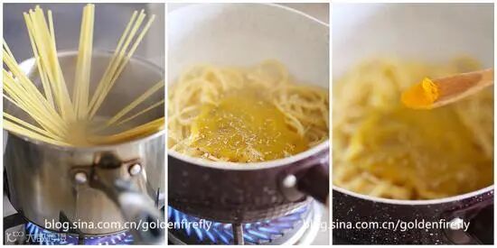 4. 放意大利面+少量盐的水中,煮约8-9分钟(依照意面标示),后捞起沥干。