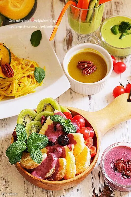 2. 准备各种喜欢的水果,果仁,沾附酱汁即可食用。
