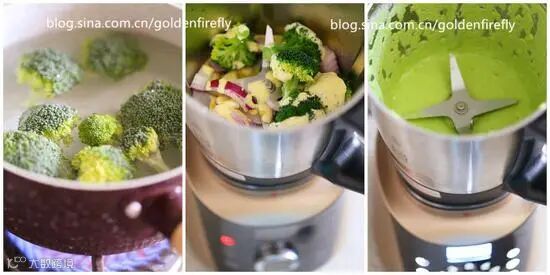 2. 将熟西兰花和所有材料放到果汁机中搅打至细腻。