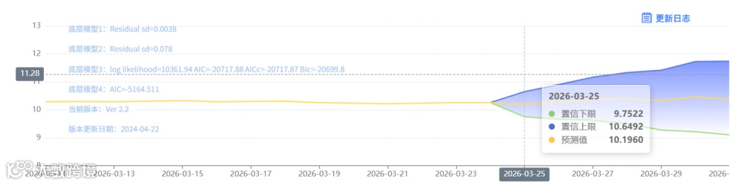 玄田算法是由项目课题组团队原创的非经典逻辑数值聚合理论和不确定性预测方法,构建了基于一致模算子的生猪价格预测模型。该模型采用的聚合函数及一致模相关理论与方法已获得多项国家自然科学基金和省级自然科学资金资助,并获得多项省级自然科学奖奖项。03月25日预测猪价为10.1960,置信区间在9.7522--10.6492之间。03月26日预测猪价为10.2761;03月27日预测猪价为10.3824。