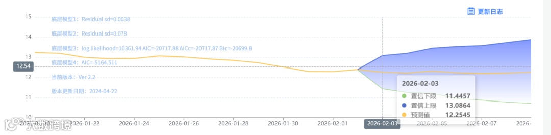 玄田算法是由项目课题组团队原创的非经典逻辑数值聚合理论和不确定性预测方法,构建了基于一致模算子的生猪价格预测模型。该模型采用的聚合函数及一致模相关理论与方法已获得多项国家自然科学基金和省级自然科学资金资助,并获得多项省级自然科学奖奖项。02月03日预测猪价为12.2545,置信区间在11.4457--13.0864之间。02月04日预测猪价为12.2142;02月05日预测猪价为12.3125。