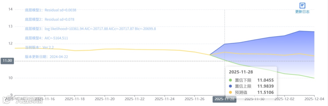 玄田算法是由项目课题组团队原创的非经典逻辑数值聚合理论和不确定性预测方法,构建了基于一致模算子的生猪价格预测模型。该模型采用的聚合函数及一致模相关理论与方法已获得多项国家自然科学基金和省级自然科学资金资助,并获得多项省级自然科学奖奖项。11月28日预测猪价为11.5106,置信区间在11.0455--11.9535之间。11月29日预测猪价为11.4197;11月30日预测猪价为11.4109。
