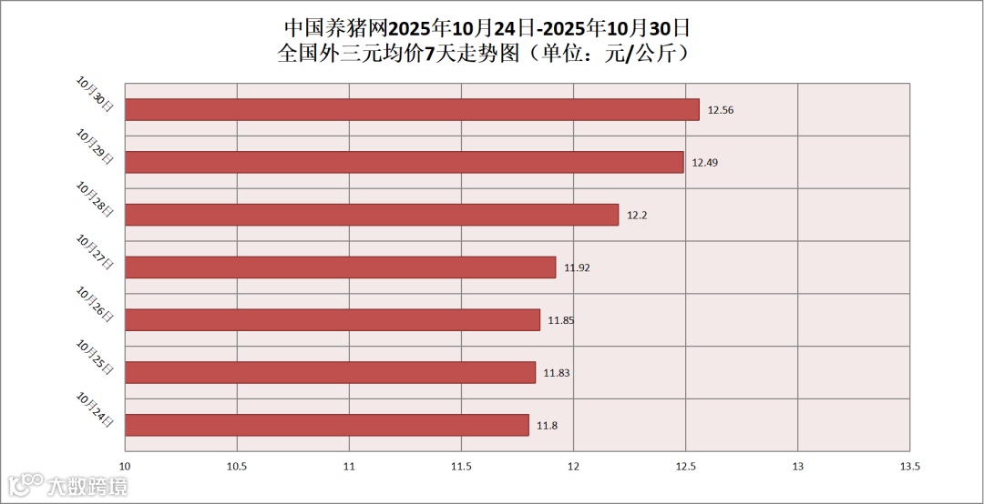2025年10月30日(星期四),据中国养猪网猪价系统监测,全国外三元均价为12.56元/公斤,猪价较昨日(12.49元/公斤)上涨了0.07元/公斤,较上月(12.24元/公斤)上涨了0.32元/公斤。