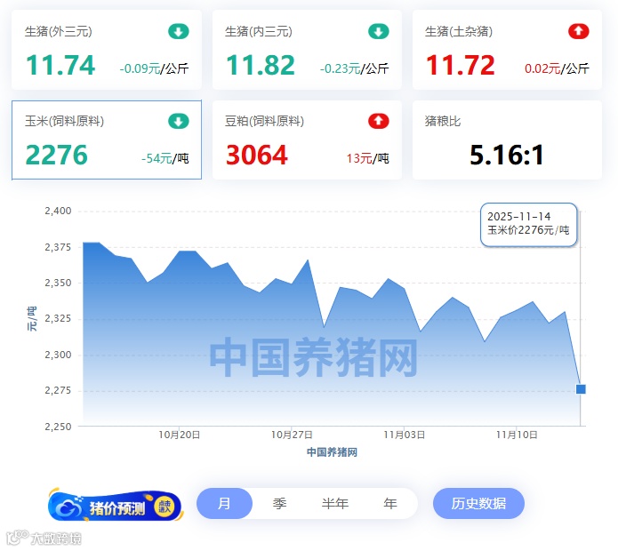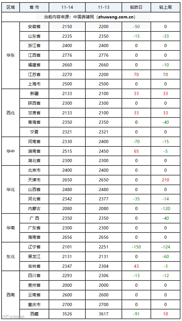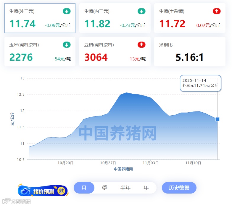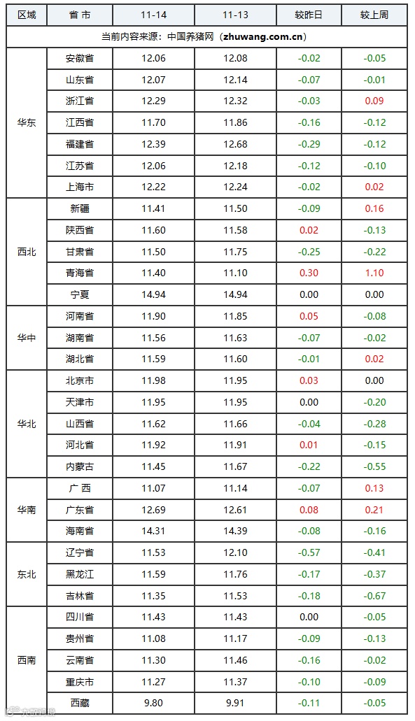 外三元生猪全国均价为11.74元/公斤,较昨日下跌0.09元/公斤。今日全国生猪市场整体呈现偏弱运行态势。从区域价格来看,除青海、河南、北京、广东等个别省份价格略有反弹外,绝大多数省市猪价均出现下跌,其中辽宁、福建、甘肃等省份跌幅较为显著,反映出生猪供应压力持续加大。当前市场底部支撑较弱,主要由于养殖端前期压栏惜售导致存栏体重上升,特别是中大猪供应能力逐步恢复,而终端消费承接力度不足,标肥价差持续收窄,进一步削弱了养殖户对后市的看涨情绪。同时,近期气温波动加大,猪场疫病风险上升,部分养殖户出于避险考虑选择“落袋为安”,加快出栏节奏,进一步加剧了市场供给压力。总的来说,在供强需弱的格局下,猪价短期内承压态势仍将延续,市场情绪趋于谨慎。2025年11月14日-中国养猪网