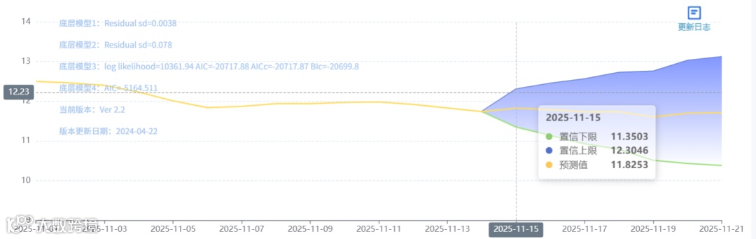 玄田算法是由项目课题组团队原创的非经典逻辑数值聚合理论和不确定性预测方法,构建了基于一致模算子的生猪价格预测模型。该模型采用的聚合函数及一致模相关理论与方法已获得多项国家自然科学基金和省级自然科学资金资助,并获得多项省级自然科学奖奖项。11月15日预测猪价为11.8253,置信区间在11.3503--12.3046之间。11月16日预测猪价为11.7873;11月17日预测猪价为11.7335。