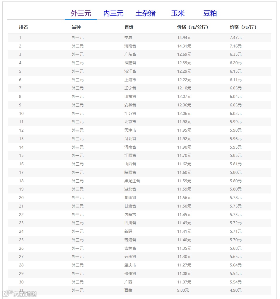 外三元排行前三:宁夏回族自治区14.94元/公斤、海南省14.31元/公斤、广东省12.69元/公斤;