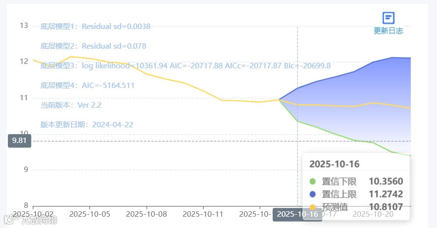 玄田算法是由项目课题组团队原创的非经典逻辑数值聚合理论和不确定性预测方法,构建了基于一致模算子的生猪价格预测模型。该模型采用的聚合函数及一致模相关理论与方法已获得多项国家自然科学基金和省级自然科学资金资助,并获得多项省级自然科学奖奖项。10月16日预测猪价为10.8107,置信区间在10.3560--11.2742之间。10月17日预测猪价为10.8140;10月18日预测猪价为10.7831。