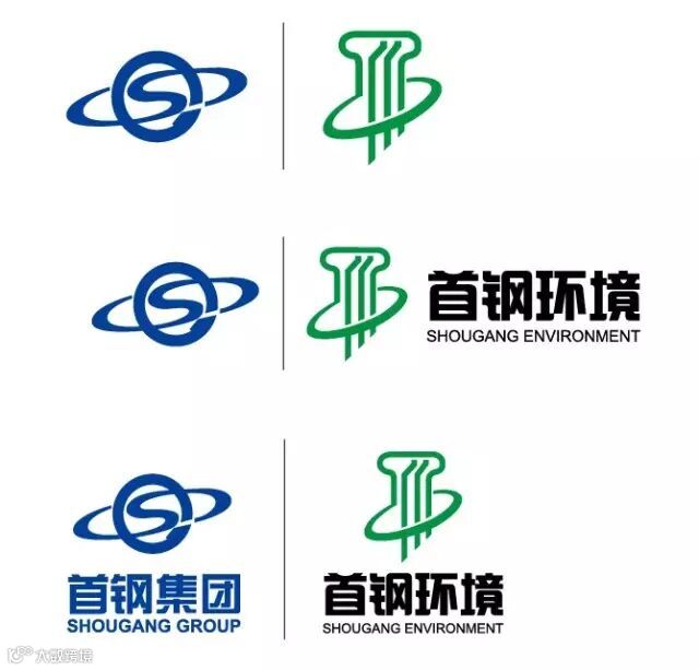 整体组合标识以“首钢蓝 ,环保绿 ”为主色调,左侧为首钢集团“SG”标志,右侧为首钢环境标志,代表首钢环境公司为首钢集团下属全资子公司。