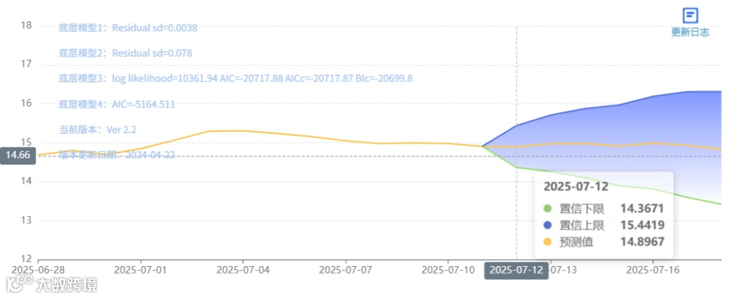 玄田算法是由项目课题组团队原创的非经典逻辑数值聚合理论和不确定性预测方法,构建了基于一致模算子的生猪价格预测模型。该模型采用的聚合函数及一致模相关理论与方法已获得多项国家自然科学基金和省级自然科学资金资助,并获得多项省级自然科学奖奖项。07月12日预测猪价为14.8967,置信区间在14.3671--15.4419之间。07月13日预测猪价为14.9760;07月14日预测猪价为14.9818。