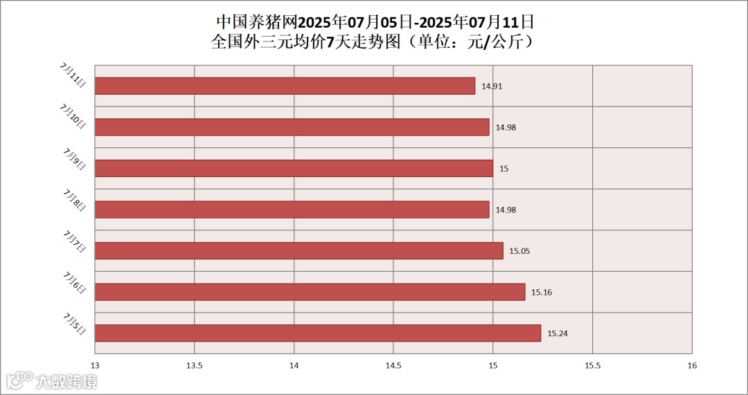 2025年07月11日(星期五),据中国养猪网猪价系统监测,全国外三元均价为14.91元/公斤,猪价较昨日(14.98元/公斤)下跌了0.07元/公斤,较上月(14.03元/公斤)上涨了0.88元/公斤。