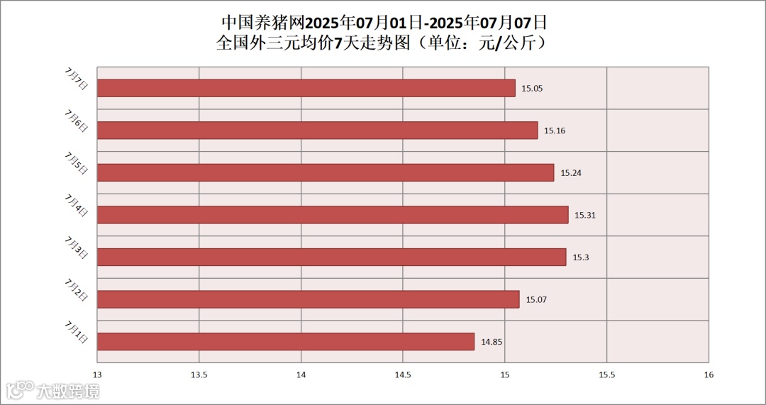 2025年07月07日(星期一),据中国养猪网猪价系统监测,全国外三元均价为15.05元/公斤,猪价较昨日(15.16元/公斤)下跌了0.11元/公斤,较上月(14.09元/公斤)上涨了0.96元/公斤。