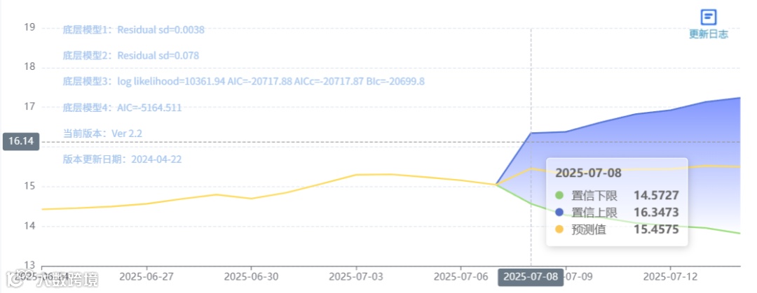 玄田算法是由项目课题组团队原创的非经典逻辑数值聚合理论和不确定性预测方法,构建了基于一致模算子的生猪价格预测模型。该模型采用的聚合函数及一致模相关理论与方法已获得多项国家自然科学基金和省级自然科学资金资助,并获得多项省级自然科学奖奖项。07月08日预测猪价为15.4575,置信区间在14.5727--16.3473之间。07月09日预测猪价为15.3205;07月10日预测猪价为15.4133。
