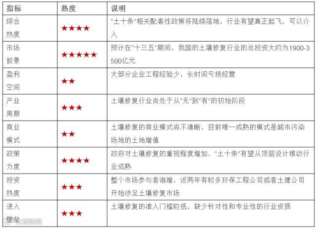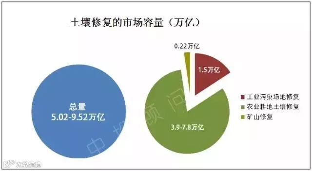 由于我国的土壤修复尚处于从“无”到“有”的初始阶段,从已有项目的地域分布来看,经济较发达的江浙沪、鄂湘粤地区领先于全国;从项目的类别来看,由于城市内的“棕地开发”所具有的土地开发价值,工业污染场地修复略微领先于农业耕地的修复和矿山修复,因此在“十三五”期间,假设工业污染场地、农业耕地和矿山的修复比例分别为7%、3%和5%,则对应的市场空间约为1900-3500亿元。