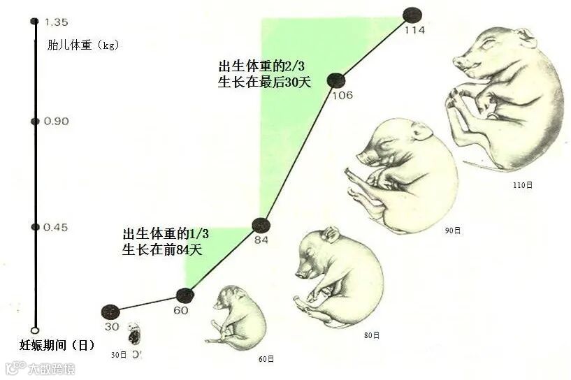 出生重一两,断奶多一斤,出栏多十斤”,在这一理念的指导下,母猪妊娠后期作为胎儿生长发育的黄金时期,养猪企业普遍采用“攻胎”策略,即在妊娠后期增加母猪的饲料量,以促进胎儿生长,增加仔猪的初生重。然而,随着现代养猪行业的发展,人们逐渐认识到在母猪妊娠后期进行“攻胎”的策略存在诸多局限性,精准供给的养殖理念应运而生,为母猪妊娠后期的营养管理提供了新的管理思路。