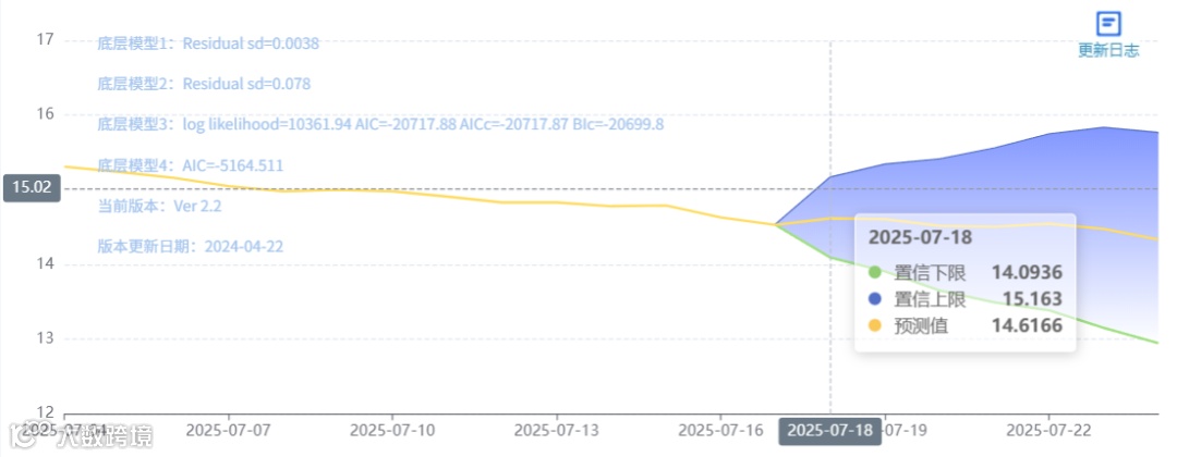 玄田算法是由项目课题组团队原创的非经典逻辑数值聚合理论和不确定性预测方法,构建了基于一致模算子的生猪价格预测模型。该模型采用的聚合函数及一致模相关理论与方法已获得多项国家自然科学基金和省级自然科学资金资助,并获得多项省级自然科学奖奖项。07月18日预测猪价为14.6166,置信区间在14.0936--15.163之间。07月19日预测猪价为14.6072;07月20日预测猪价为14.5171。