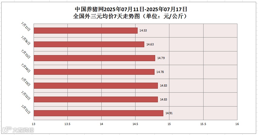 2025年07月17日(星期四),据中国养猪网猪价系统监测,全国外三元均价为14.53元/公斤,猪价较昨日(14.63元/公斤)下跌了0.10元/公斤,较上月(14.24元/公斤)上涨了0.39元/公斤。