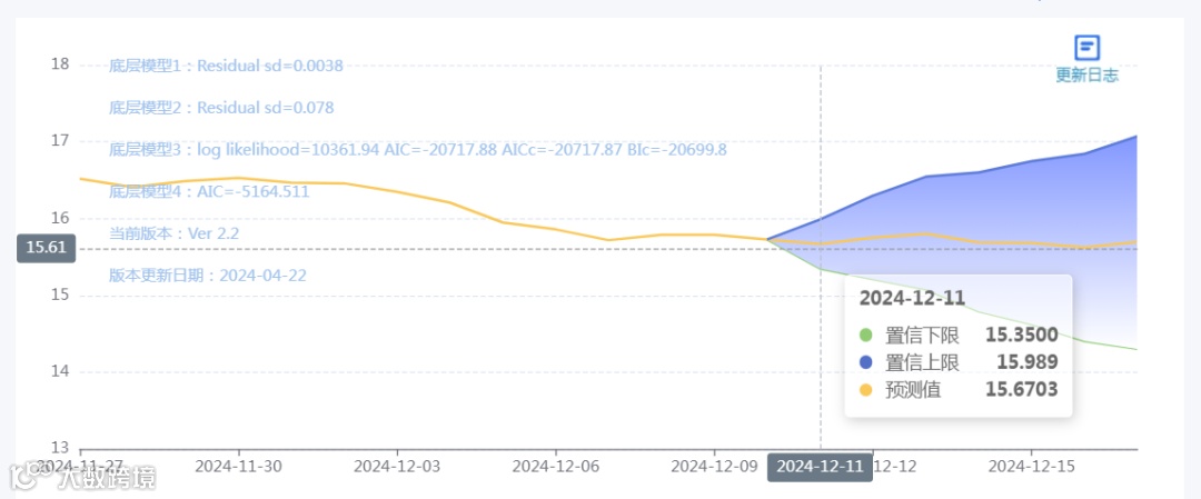 玄田算法是由项目课题组团队原创的非经典逻辑数值聚合理论和不确定性预测方法,构建了基于一致模算子的生猪价格预测模型。该模型采用的聚合函数及一致模相关理论与方法已获得多项国家自然科学基金和省级自然科学资金资助,并获得多项省级自然科学奖奖项。12月11日预测猪价为15.6703,置信区间在15.3500--15.989之间。12月12日预测猪价为15.7512;12月13日预测猪价为15.8043。