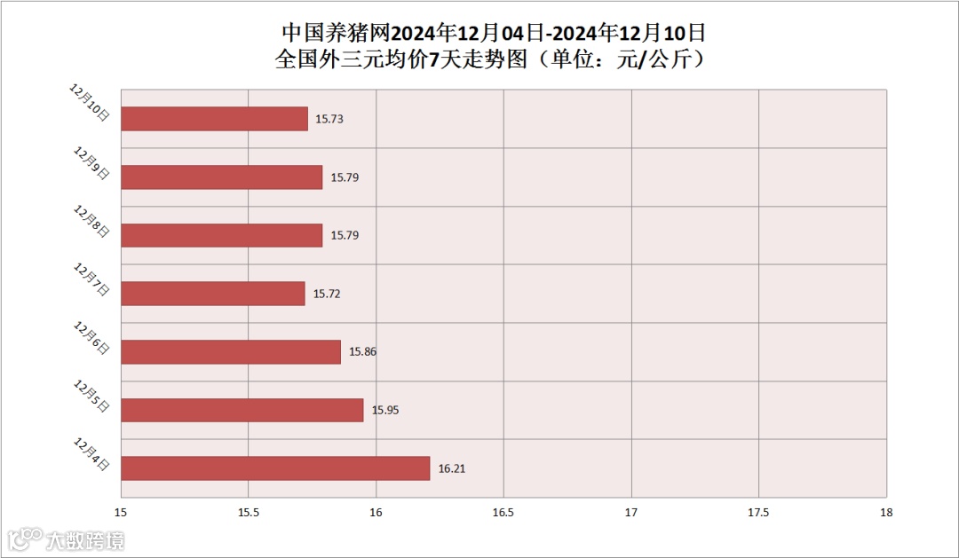 2024年12月10日(星期二),据中国养猪网猪价系统监测,全国外三元均价为15.73元/公斤,猪价较昨日(15.79元/公斤)下跌了0.06元/公斤,较上月(16.77元/公斤)下跌了1.04元/公斤。
