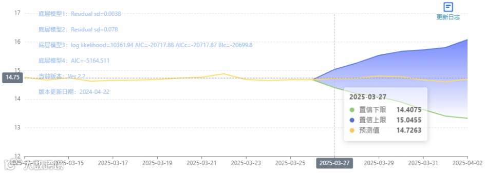玄田算法是由项目课题组团队原创的非经典逻辑数值聚合理论和不确定性预测方法,构建了基于一致模算子的生猪价格预测模型。该模型采用的聚合函数及一致模相关理论与方法已获得多项国家自然科学基金和省级自然科学资金资助,并获得多项省级自然科学奖奖项。03月27日预测猪价为14.7263,置信区间在14.4075--15.0455之间。03月28日预测猪价为14.7316;03月29日预测猪价为14.8141。