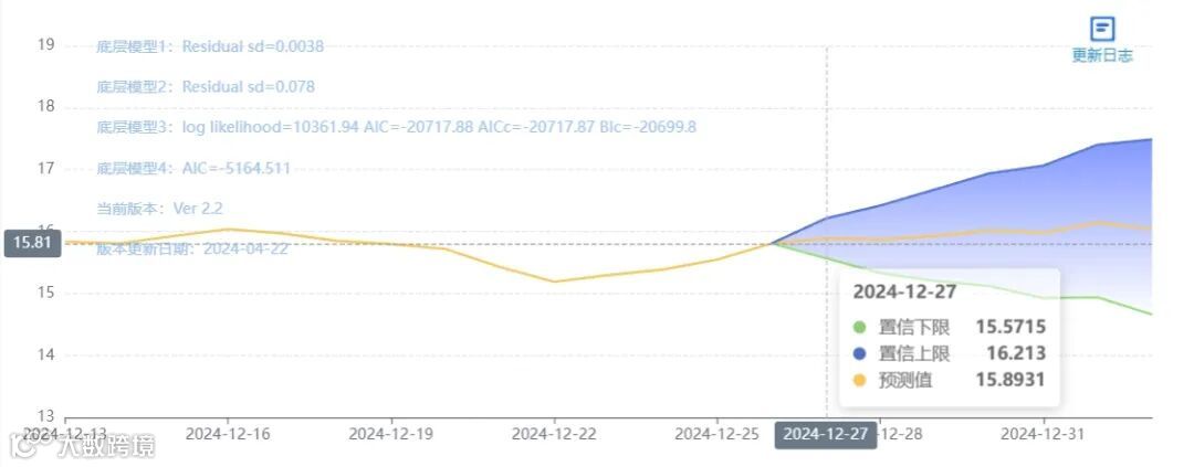 玄田算法是由项目课题组团队原创的非经典逻辑数值聚合理论和不确定性预测方法,构建了基于一致模算子的生猪价格预测模型。该模型采用的聚合函数及一致模相关理论与方法已获得多项国家自然科学基金和省级自然科学资金资助,并获得多项省级自然科学奖奖项。12月27日预测猪价为15.5499,置信区间在15.0075--16.0969之间。12月28日预测猪价为15.5825;12月29日预测猪价为15.6356。