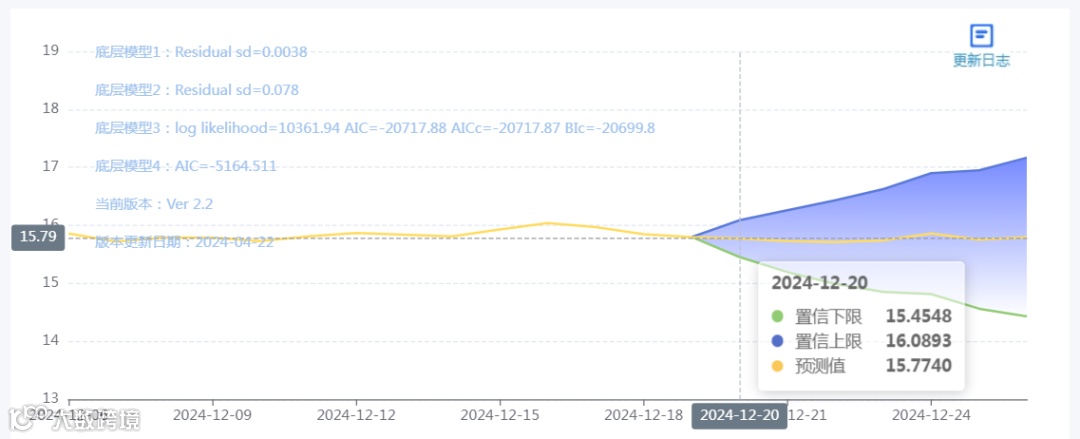 玄田算法是由项目课题组团队原创的非经典逻辑数值聚合理论和不确定性预测方法,构建了基于一致模算子的生猪价格预测模型。该模型采用的聚合函数及一致模相关理论与方法已获得多项国家自然科学基金和省级自然科学资金资助,并获得多项省级自然科学奖奖项。12月20日预测猪价为15.7740,置信区间在15.4548--16.0893之间。12月21日预测猪价为15.7313;12月22日预测猪价为15.7152。