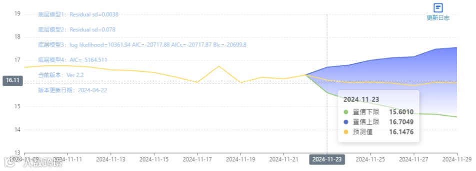 玄田算法是由项目课题组团队原创的非经典逻辑数值聚合理论和不确定性预测方法,构建了基于一致模算子的生猪价格预测模型。该模型采用的聚合函数及一致模相关理论与方法已获得多项国家自然科学基金和省级自然科学资金资助,并获得多项省级自然科学奖奖项。11月23日预测猪价为16.1476,置信区间在15.6010--16.7049之间。11月24日预测猪价为16.0411;11月25日预测猪价为16.0634。