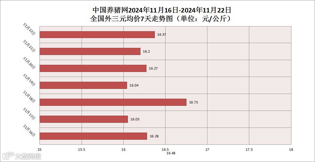 2024年11月22日(星期五),据中国养猪网猪价系统监测,全国外三元均价为16.37元/公斤,猪价较昨日(16.20元/公斤)上涨了0.17元/公斤,较上月(17.29元/公斤)下跌了0.92元/公斤。
