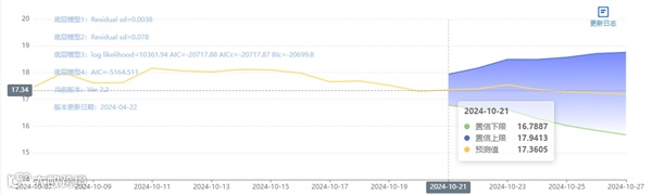 玄田算法是由项目课题组团队原创的非经典逻辑数值聚合理论和不确定性预测方法,构建了基于一致模算子的生猪价格预测模型。该模型采用的聚合函数及一致模相关理论与方法已获得多项国家自然科学基金和省级自然科学资金资助,并获得多项省级自然科学奖奖项。10月21日预测猪价为17.3605,置信区间在16.7887--17.9473之间。10月22日预测猪价为17.3989;10月23日预测猪价为17.5496。