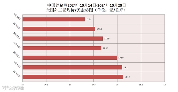其他生猪品种方面,生猪内三元均价为17.50元/公斤,价格较昨日(17.59元/公斤)下跌了0.09元/公斤;生猪土杂猪均价为17.12元/公斤,价格较昨日(17.23元元/公斤)下跌了0.11元/公斤。