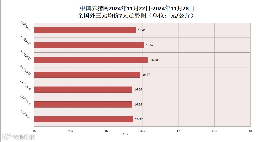 根据“2024年11月28日-中国养猪网生猪(外三元)均价涨跌表”发现,国内外三元生猪价格呈现震荡下跌的态势,在全国可监测的31个省/市/自治区中,猪价走势为2涨4平25跌。11月是传统消费旺季,但立冬后猪价却震荡偏弱。由于气温下降不及预期,生猪供应增速超过消费需求,市场供过于求,导致猪价承压下跌,11月19日生猪均价触底16元/公斤,月内累计下降超7.6%。下旬冷空气来袭,气温显著下降,市场支撑转强,但猪价短暂反弹后仍承压下跌。至11月28日,全国瘦肉型标猪出栏均价跌至16.41元/公斤,全国南北7个生猪产区猪价全面下跌,不过,市场也存在一定支撑。需求方面,北京白条报价企稳,上海成交价上涨,但整体购销一般,腌腊需求提升有限,屠企开工率下降。供应方面,华中地区集团猪企出栏减量,西南增量,东北屠企收猪难度一般,华东、华中猪场出栏减量,屠企缺猪现象增加,西南腌腊现象增多,市场情绪转强。综合来看,猪价下跌后劲不足,底部支撑转强,养殖端认卖意愿减弱,需求逐步改善,市场存在逆势上涨的可能,后市需关注养殖端出栏及需求变化。