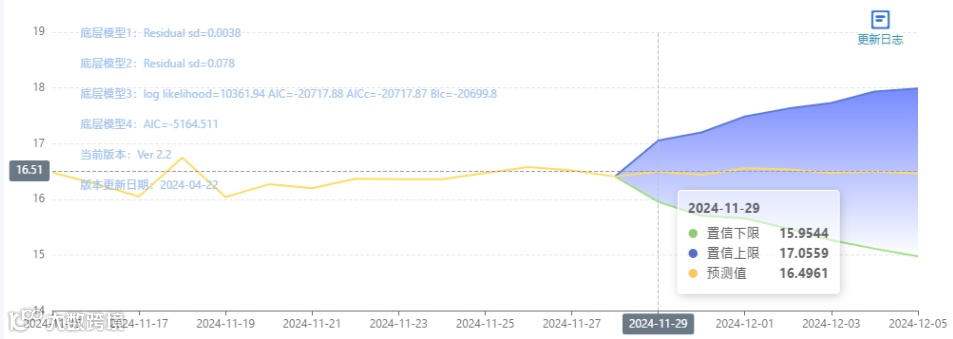 玄田算法是由项目课题组团队原创的非经典逻辑数值聚合理论和不确定性预测方法,构建了基于一致模算子的生猪价格预测模型。该模型采用的聚合函数及一致模相关理论与方法已获得多项国家自然科学基金和省级自然科学资金资助,并获得多项省级自然科学奖奖项。11月29日预测猪价为16.4961,置信区间在15.9544--17.0559之间。11月30日预测猪价为16.4377;12月1日预测猪价为16.5576。