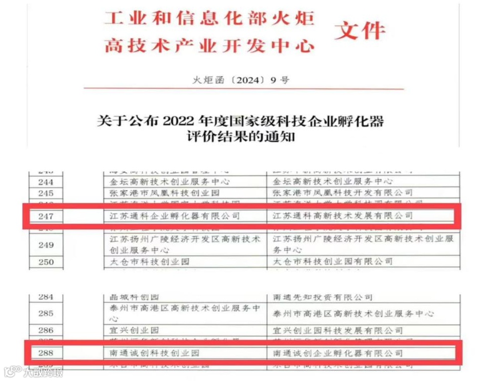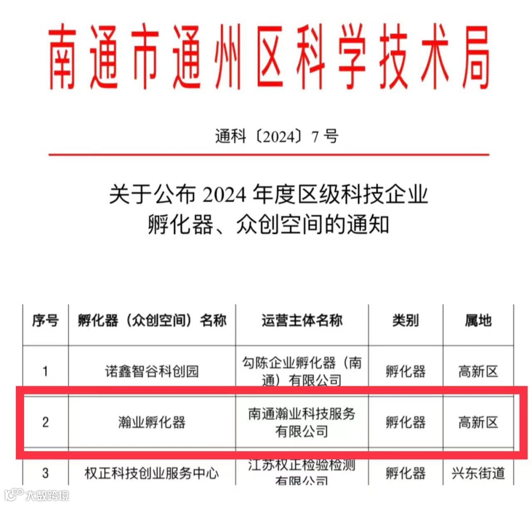 6月26日,南通市通州区科学技术局公示《关于公布 2024 年度区级科技企业孵化器、众创空间的通知》,瀚业孵化器获得“区级科技企业孵化器”认定。