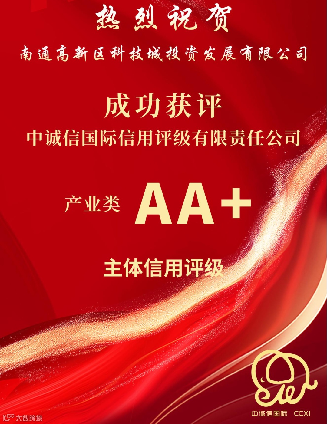 近日,南通高新区科技城投资发展有限公司(以下简称“科技城投资公司”)成功获得由中诚信国际信用评级有限责任公司授予的产业类AA+主体信用评级,评级展望为稳定,是苏中地区高新科创园区类及通州区首家产业类AA+的主体。这一权威评级的获得,充分体现了科技城投资公司在资本市场的信用实力与稳健发展能力,标志着公司在产业园区投资运营及科技创新服务领域的综合竞争力被广泛认可。