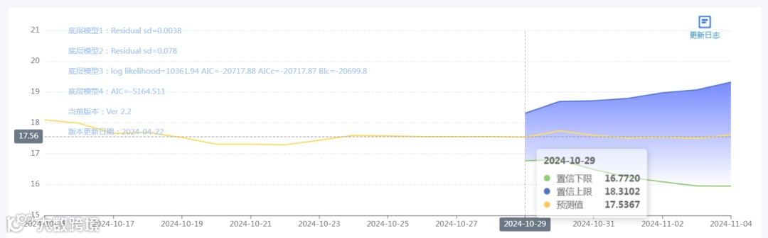 玄田算法是由项目课题组团队原创的非经典逻辑数值聚合理论和不确定性预测方法,构建了基于一致模算子的生猪价格预测模型。该模型采用的聚合函数及一致模相关理论与方法已获得多项国家自然科学基金和省级自然科学资金资助,并获得多项省级自然科学奖奖项。10月29日预测猪价为17.5367,置信区间在16.7720--18.3102之间。10月30日预测猪价为17.7412;10月31日预测猪价为17.5936。