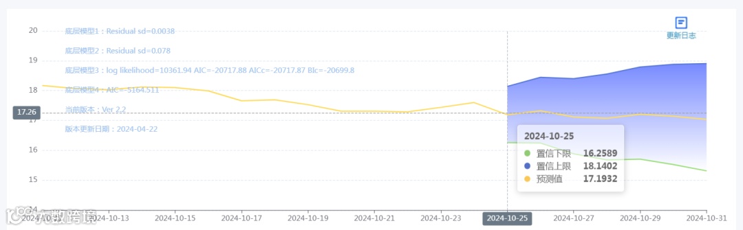 玄田算法是由项目课题组团队原创的非经典逻辑数值聚合理论和不确定性预测方法,构建了基于一致模算子的生猪价格预测模型。该模型采用的聚合函数及一致模相关理论与方法已获得多项国家自然科学基金和省级自然科学资金资助,并获得多项省级自然科学奖奖项。10月25日预测猪价为17.1932,置信区间在16.2589--18.1402之间。10月26日预测猪价为17.3238;10月27日预测猪价为17.1174。