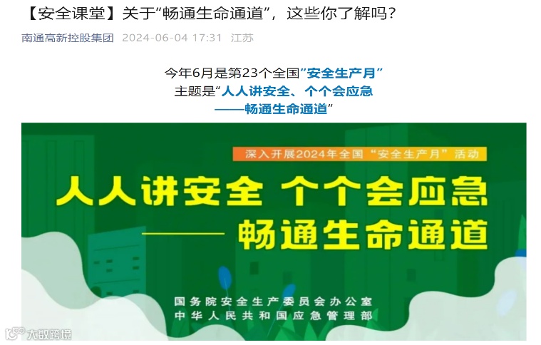 今年6月是第23个全国“安全生产月”,南通高新控股集团紧扣“人人讲安全,个个会应急——畅通生命通道”主题,深化开展安全培训、逃生演练与安全检查等系列活动,切实提高集团全员安全素养、应急逃生和自救互救能力,营造“人人讲安全、个个会应急”的安全生产浓厚氛围。